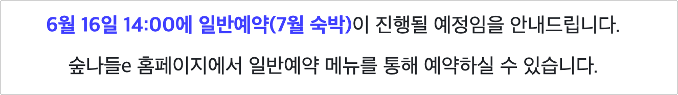 당장 급한 예약은 7월 예약입니다. 역시 국립휴양림 기준으로 7월 하반기는 성수기로 추첨제인데요, 수락휴 경우 7월에도 그냥 일반예약으로만 진행하는지 명확하게 나와있지 않습니다. 6월 16일 (월) 14:00 에 일반예약을 하면서 확인해봐야겠습니다.