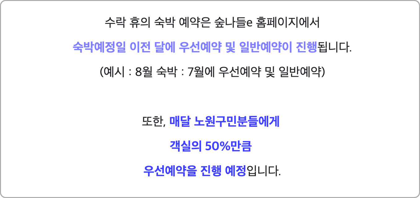 8월 숙박에 대한 우선예약은 7월 7일 (월) ~ 7월 9일(수) 18:00 까지 진행한다고 합니다. 8월 숙박에 대한 일반 예약은 7월 10일(목) 14:00 입니다. 이 부분에서 살짝 좀 헷갈립니다. 원래 국립자연휴양림은 성수기는 추첨제 형식으로 진행되는데요, 수락휴는 성수기와 별도로 진행되는지 정확하게 알 수가 없네요. 일단 노원구청 공식사이트에 올라온 정보를 취합하면, 8월 일반 예약은 7월10일 오후 14:00 입니다. 중요하니까, 다시 정리할게요.