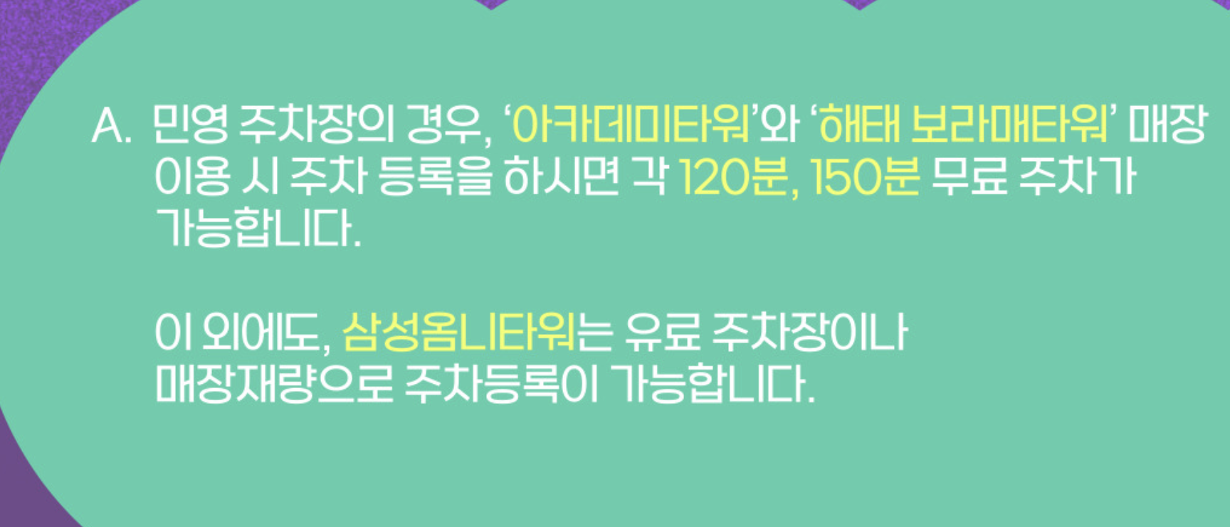 민영 주차장 경우, 아카데미타워, 해태 보라매타워 매장 이용시 주차등록하시면 120분, 150분 무료 주차 가능합니다.  삼성옴니타워는 유료 주차장이나 매장재량으로 주차등록이 가능합니다.