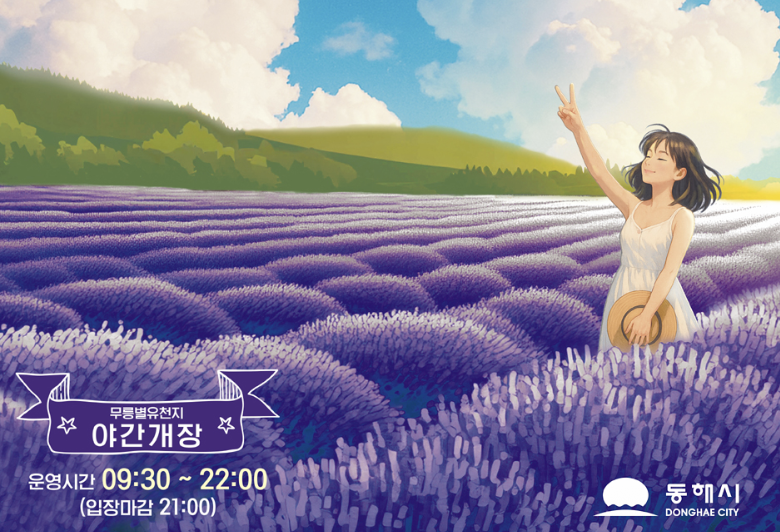 올해 라벤더축제는 2025년 6월 14일 토요일부터 22일 일요일까지, 총 9일간 열립니다. 운영 시간은 오전 9시 30분부터 밤 10시까지이며, 해가 진 후에도 은은한 조명 아래 라벤더 정원을 거닐 수 있는 ‘야간 개장’도 준비되어 있습니다. 장소는 강원특별자치도 동해시 삼화동 무릉별유천지 일원으로, 네비게이션 검색 시 ‘무릉별유천지’를 입력하면 편리합니다.