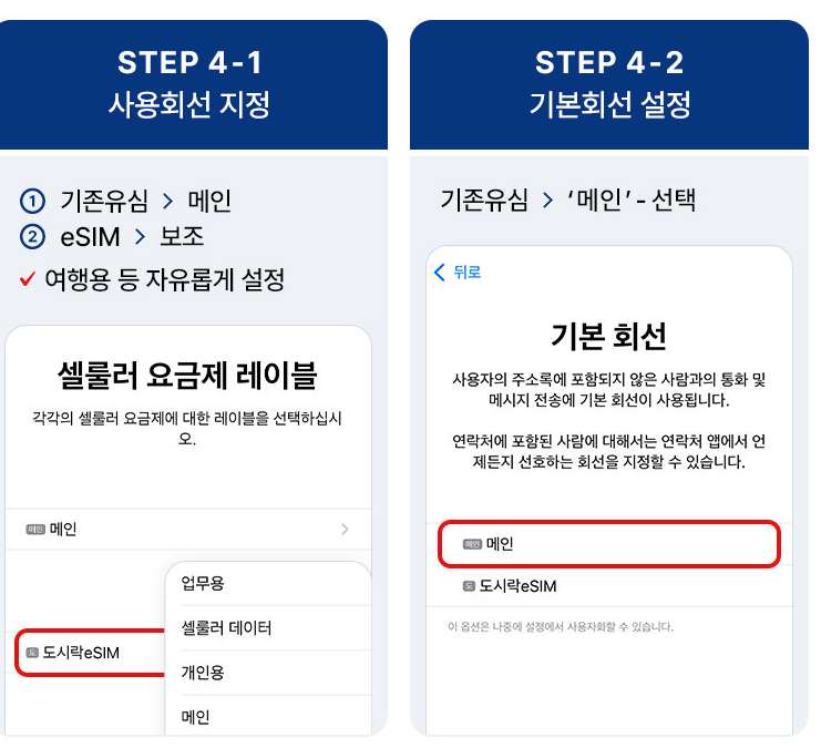 여행을 떠나기 전과 현지 도착 후에는 설정을 변경해줘야 합니다. 단순히 설치만 하고 방치하면, 데이터가 기존 유심(메인)으로 나가며 해외 로밍 요금 폭탄을 맞을 수 있어요.