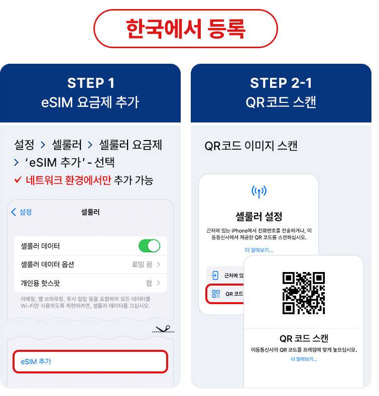 - 아이폰에서 설정 > 셀룰러 > 셀룰러 요금제 추가로 이동