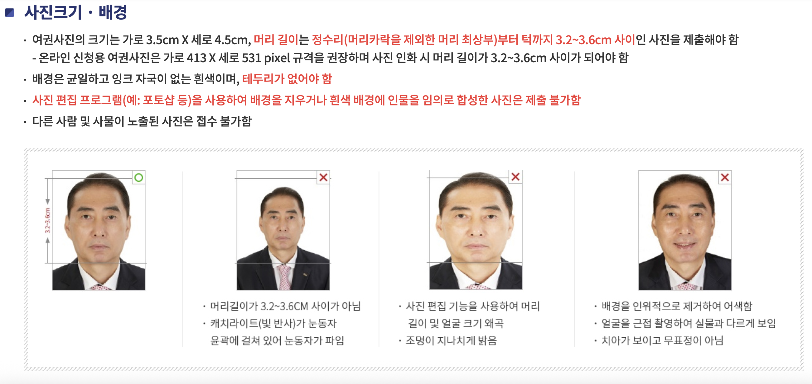 얼굴을 가까이 근접 촬영하면 실제 얼굴에서 왜곡이 발생하기 때문에 다르게 보여서 안된다고 하네요.  아래 사진을 살펴보면, 정말 같은 인물이지만 다르게 느껴지잖아요.   배경색은 흰색이고, 정수리에서 턱까지 거리가 3.2 cm x 3.6 cm 사이인 사진이어야 한답니다. 이렇게까지 디테일할지는 몰랐네요.