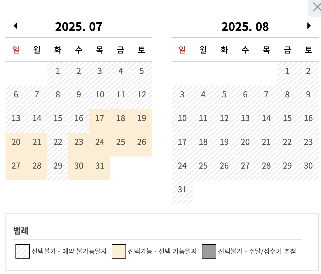 - 숙박일 선택: 원하는 날짜 선택 후, 남은 객실 확인