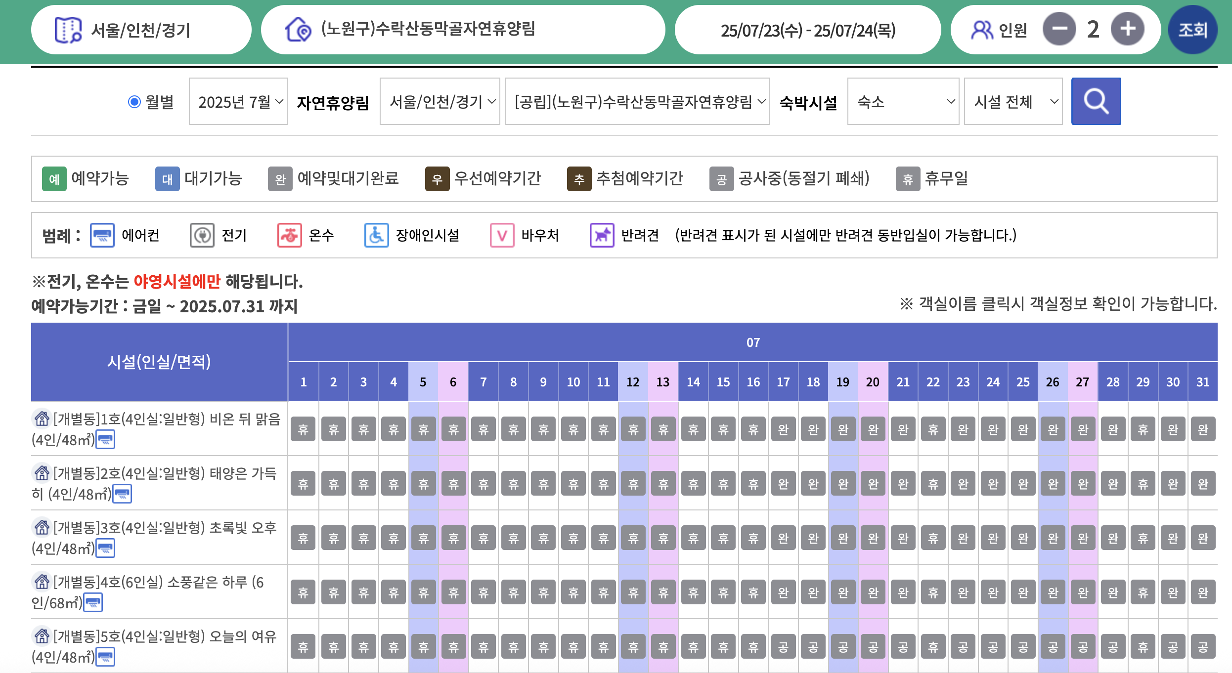 - 로그인 후 수락휴 검색: ‘수락휴 자연휴양림’ 또는 ‘노원 수락휴’ 입력