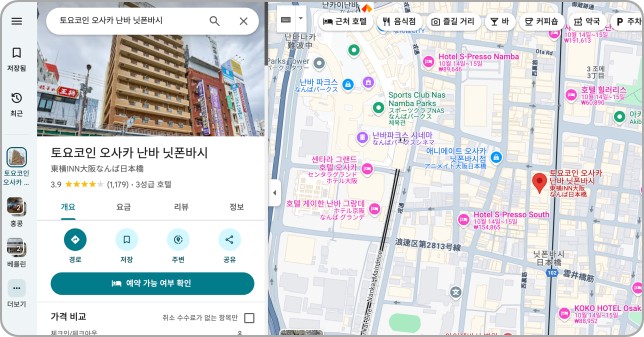 - 구글맵에 예약한 호텔 이름 입력 (예: 토요코인 오사카 신사이바시)