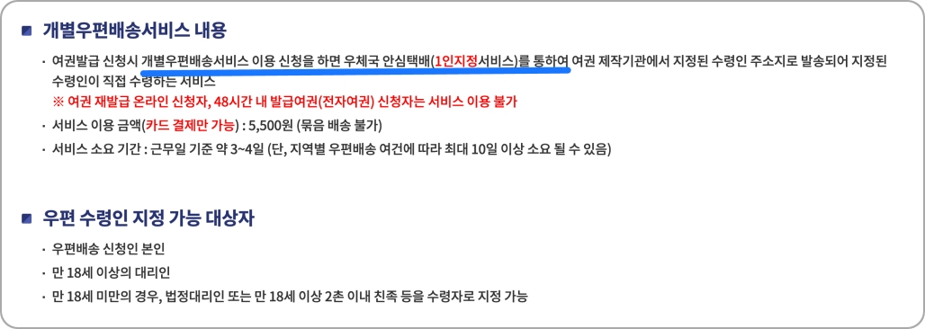뿐만 아니라, 개별 우편배송서비스를 이용해서 여권을 우체국 안심택배를 이용해서 수령할 수 있습니다. 가격은 1명당 5,500원이고 묶음 배송은 되지 않습니다. 소요 기간은 통상 3~4일 이기 때문에, 직접 수령하는 것보다 우체국 안심택배를 이용하는 것이 더 편리합니다.