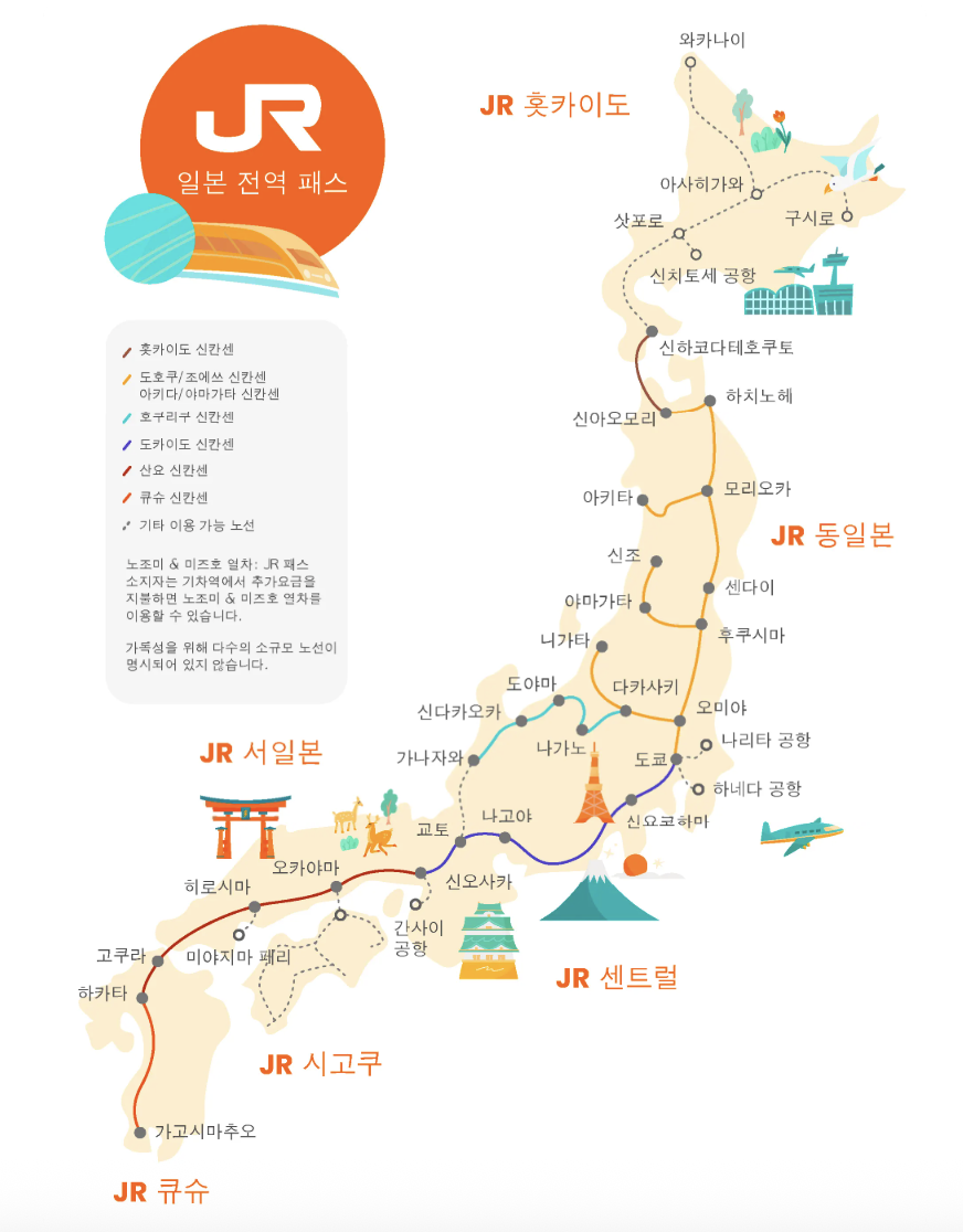 JR 패스는 일본의 JR(일본철도) 노선을 중심으로, 전국 주요 열차, 신칸센(노조미·미즈호 제외), 공항 모노레일, JR 고속버스, JR 페리까지 모두 이용할 수 있는 무제한 교통 패스입니다.