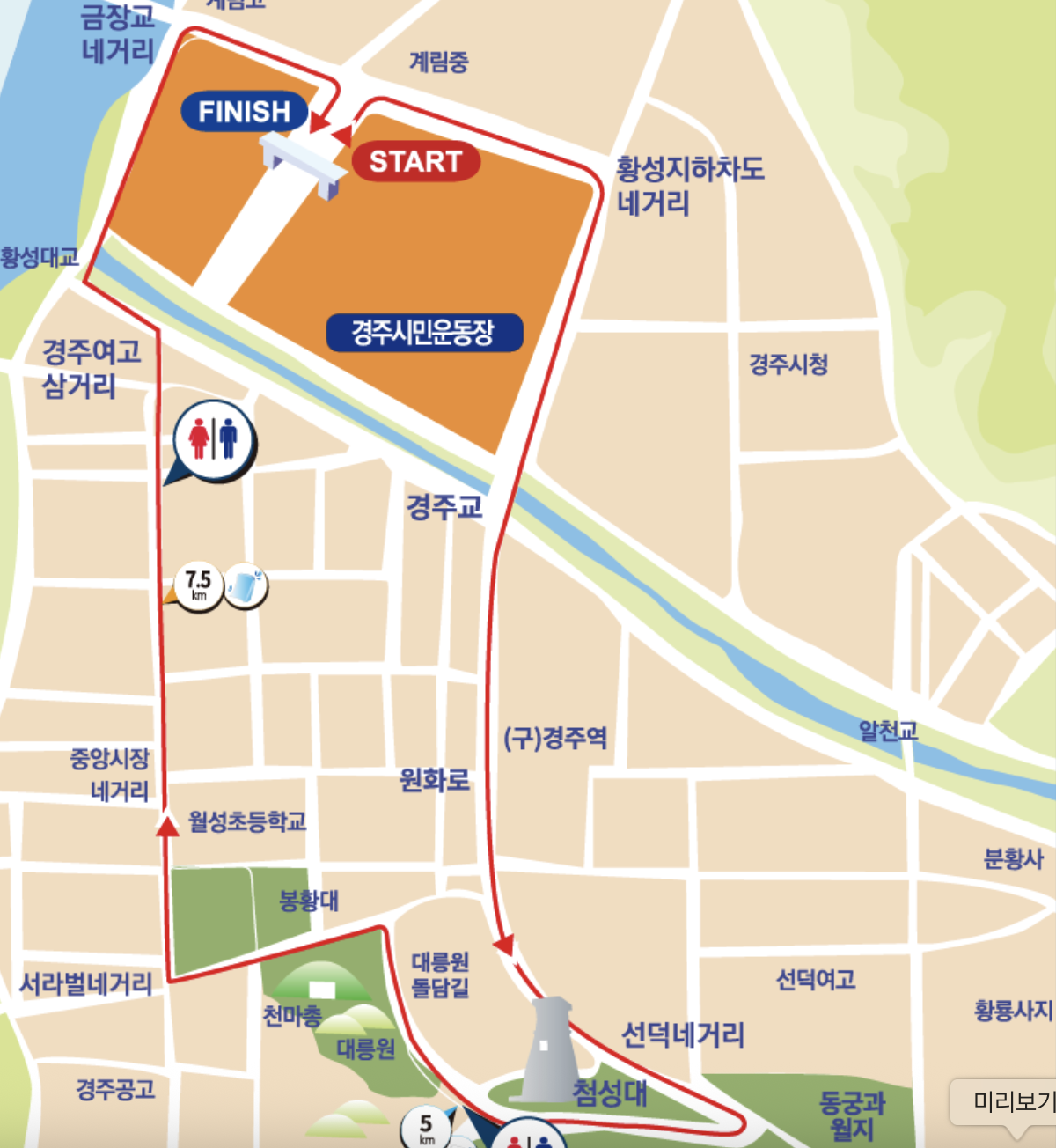 첨성대를 거쳐서 천마총, 봉황대를 거치는 코스네요. 역사유적지를 뛸 수 있는 마라톤이라니, 정말 흥미롭습니다. 동아일보에서 주최하는 마라톤이기 때문에 진행은 순조롭게 잘 진행될 것 같습니다.