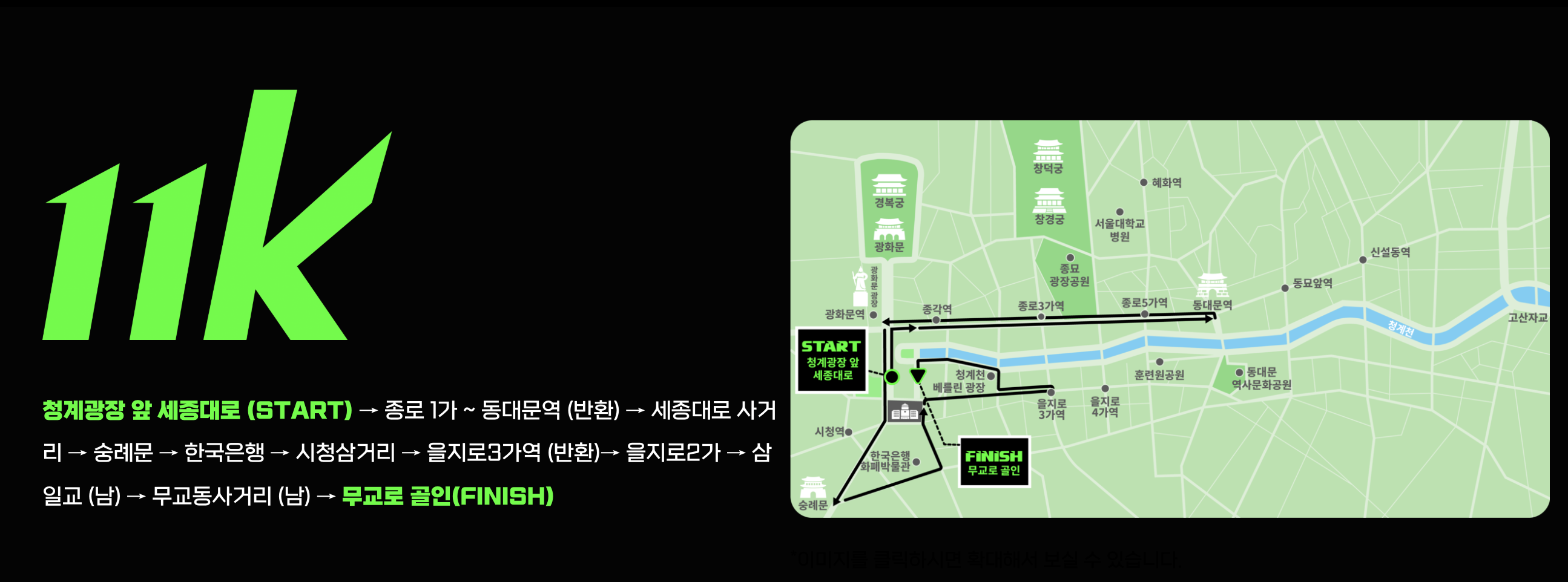 11 km 코스는 청계광장에서 출발해서 종로통을 지나서 동대문역까지 갔다가 다리 돌아와서 을지로3가쪽을 반환해서 무교동 쪽으로 오는 코스입니다. 종로통을 뛸 수 있는 마라톤이라서 아주 흥미롭습니다.